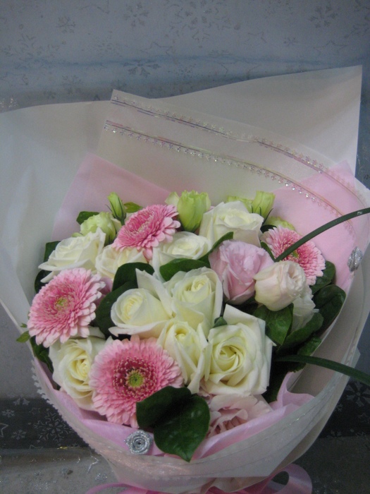 材質(料)說明: 11朵白玫瑰.粉桔梗.粉迷你太陽花.春蘭葉.茉莉葉