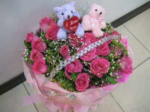 材質(料)說明: 胭脂玫瑰20支.深山櫻.滿天星.茉莉葉.2隻小熊