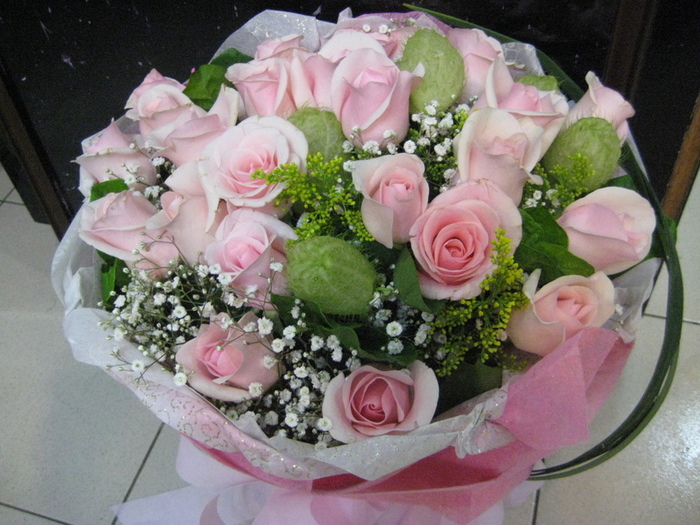 材質(料)說明: 20朵鐵達尼玫瑰.滿天星.麒麟草.唐棉.茉莉葉