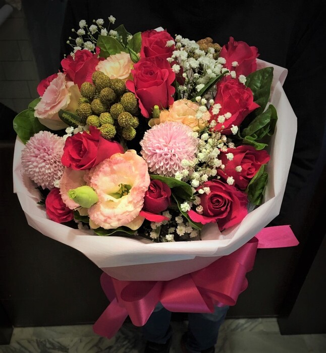 材質(料)說明: 粉乒乓、玫瑰11支、桔梗、葉材
