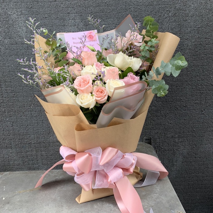 材質(料)說明:玫瑰18支、桔梗、卡斯比亞、葉材