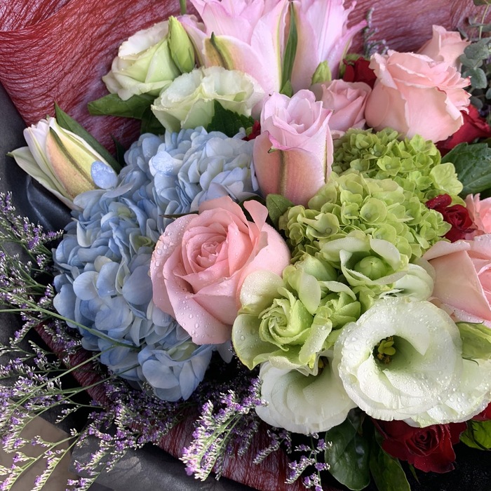 材質(料)說明: 繡球花、玫瑰百合、玫瑰、桔梗、葉材